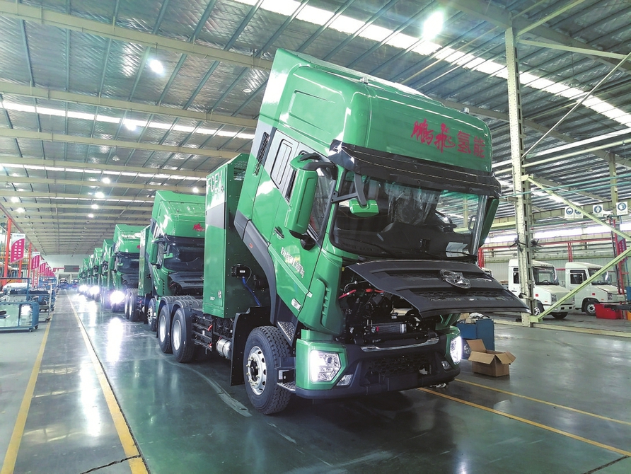 氢能重卡生产车间里,一批卡车即将交付使用。