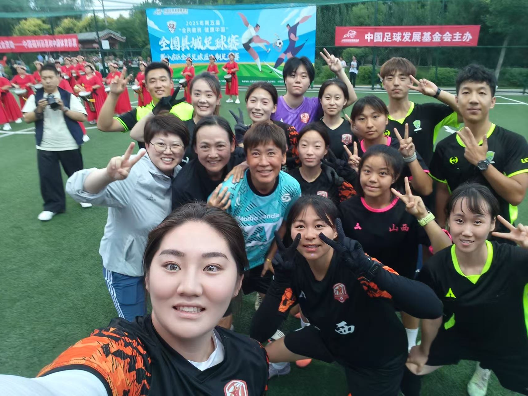 ▲2025年7月,中国女足元老韦海英(二排左二)、刘英(二排左三)在太原和卓越星女足互动