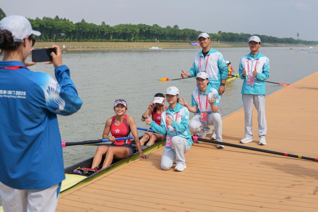 11月8日,香港队选手黄湘仪/梁琼允在女子双人单桨半决赛后与志愿者合影留念。香港队选手晋级决赛A组比赛。当日,第十五届全国运动会赛艇项目半决赛在广州举行。新华社记者 肖恩楠 摄