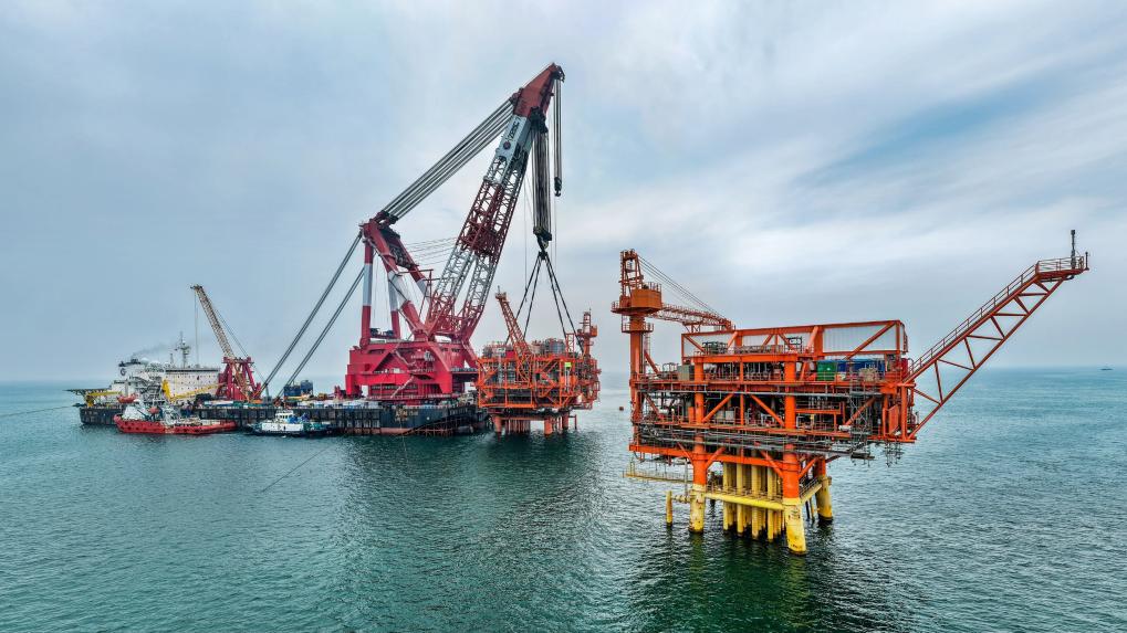 9月8日,垦利6-1油田10-1北区块Ⅱ期开发项目油气平台在渤海海域完成海上安装(无人机照片)。新华社发(杜鹏辉 摄)