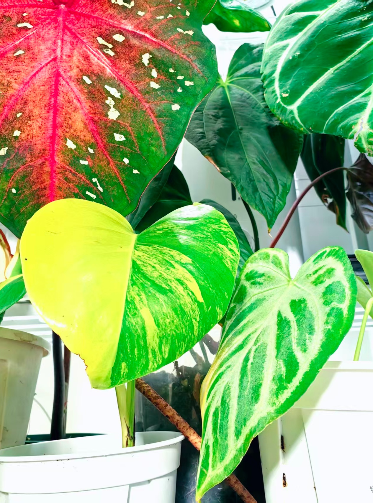 汪文俊讲述:“植物的‘锦化’实质上是一种叶绿素缺失的‘病态’。植物体内同时有胡萝卜素、叶绿素和花青素,当叶绿素缺失的时候,绿色就少了,花青素和胡萝卜素就会显现出来,出现各种各样红、黄、白的彩色。市场追求一些特殊表现的植物,比如说叶子上的红有多少,主脉是不是清晰,都有很多的专业术语,无非就是买更漂亮的个体。”