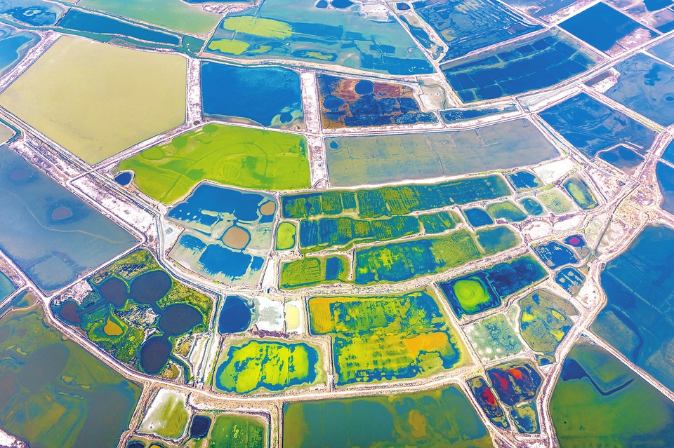 11月14日,运城盐湖呈现出色彩斑斓的别样美景。近年来,运城市通过“退盐还湖”“堤埝整治”“湿地绿化”等生态修复措施,推动盐湖生态环境持续向好。
