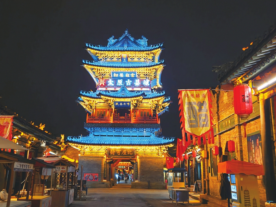 11月16日,太原古县城在灯光下呈现斑斓色彩,与青砖灰瓦相映成趣,形成独特画卷。