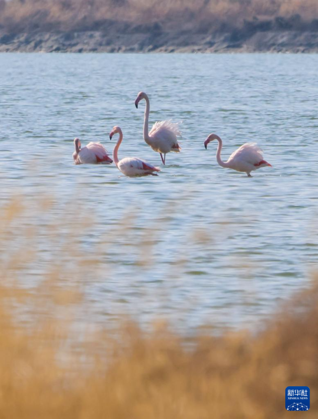 11月19日,火烈鸟在山西运城盐湖栖息。新华社发(闫鑫摄)