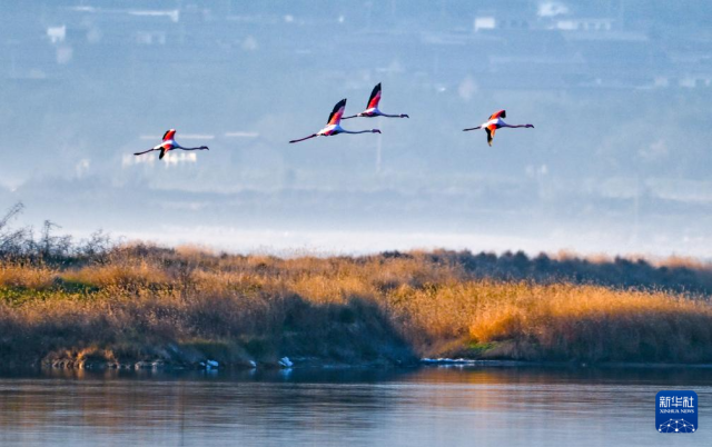 11月19日,火烈鸟在山西省运城盐湖湿地飞翔。新华社发(薛俊摄)