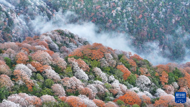 11月18日在贵州梵净山景区拍摄的雾凇红叶景观(无人机照片)。新华社发(李鹤摄)