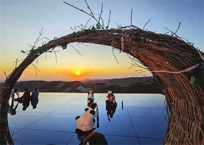 11月19日,游客们在东山天空之镜欣赏绝美落日。该景点位于太原与晋中交界处的小西沟景区,通过镜面设计与藤编圆环、月牙形座椅等元素营造梦幻氛围,成为热门打卡地。