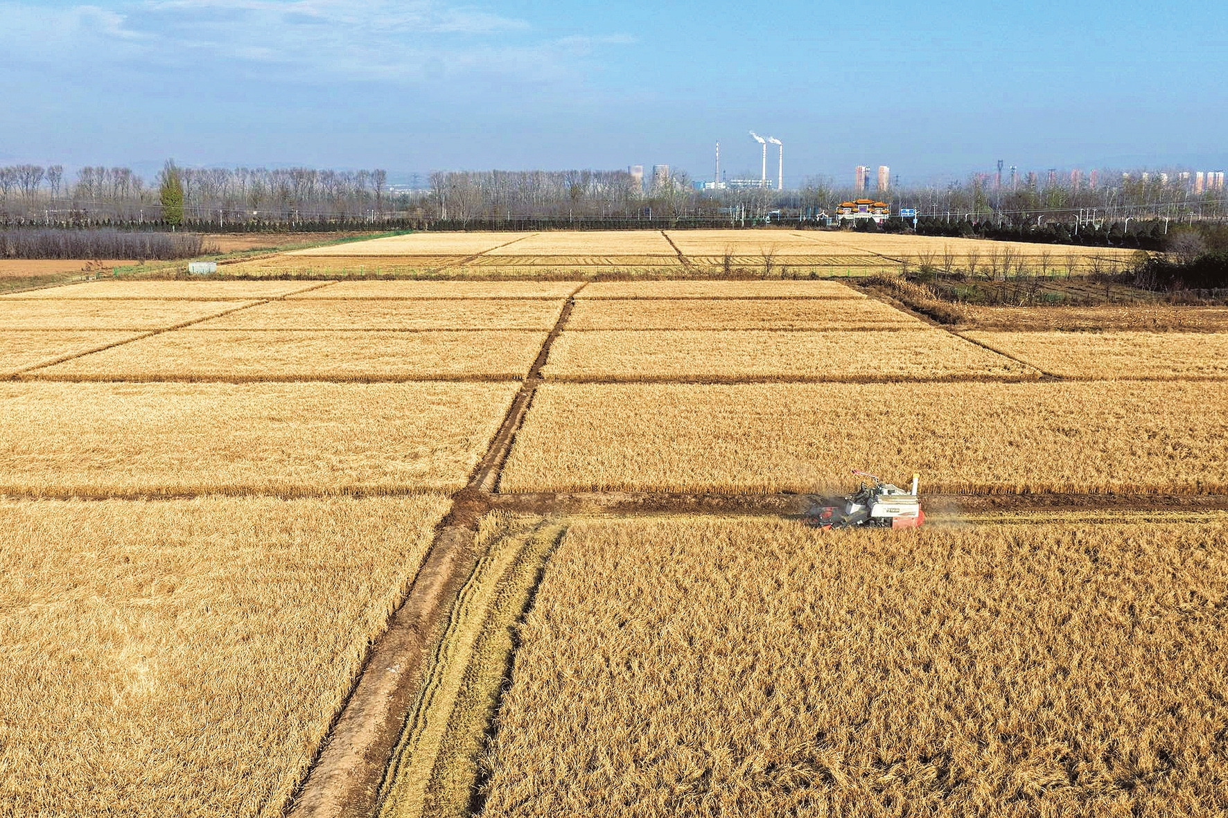 11月18日,太原市尖草坪区呼延村东侧的200余亩水稻迎来首季丰收,联合收割机开足马力在田间穿梭。当地依托映山湖区域丰富的水资源,恢复水稻种植,预计总产量可达5万多公斤。