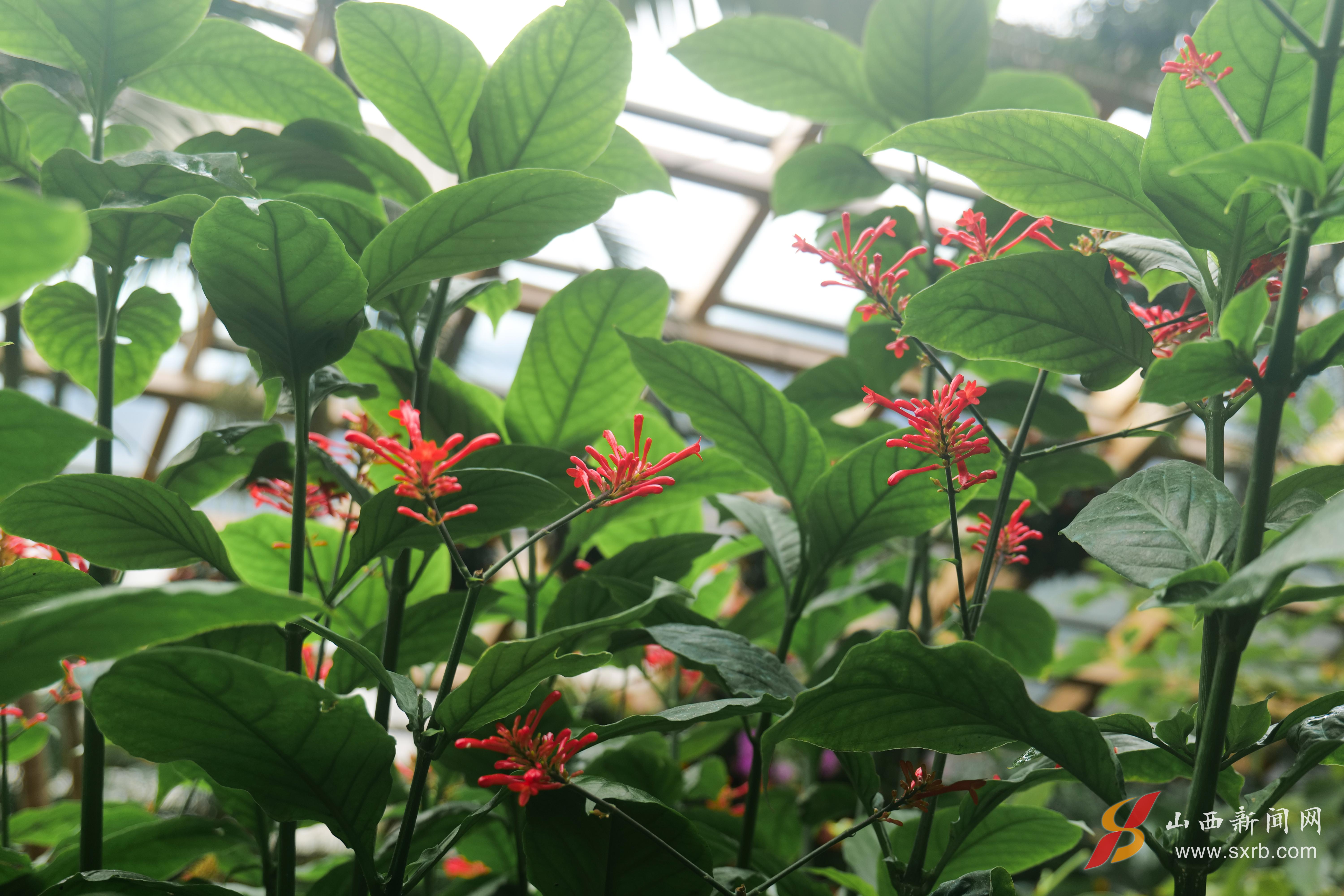 近日,太原植物园温室馆内,一种名为“红楼花”的植物正以其火红浓烈,为萧瑟的冬日增添了一抹亮丽色彩,吸引了不少游客驻足欣赏。