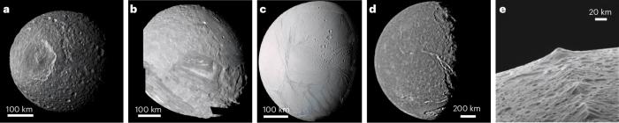 本次研究的冰卫星表面形态(a.土卫一;b.天卫五;c.土卫二;d.天卫三;e.土卫八),其中,土卫二南极虎纹裂隙正发生活跃喷发;土卫八存在成因未明的山脊;土卫一可能存在地下海洋,天卫五则呈现复杂多边形构造特征(图片来自论文)。施普林格·自然 供图