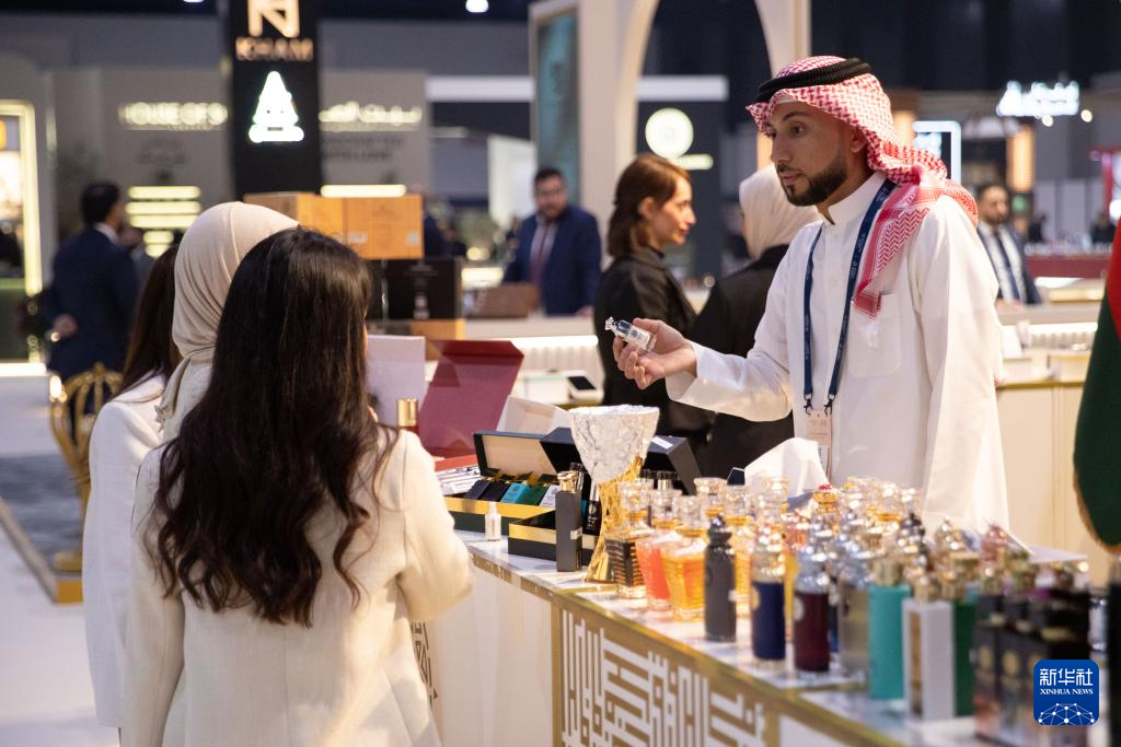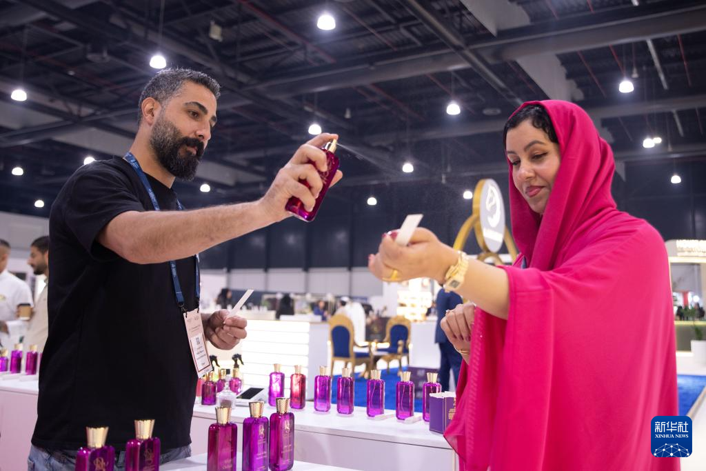 11月25日,在位于巴林首都麦纳麦的巴林世界展览中心,参展商在香水展上推介香水。