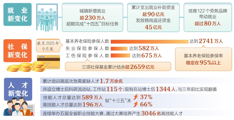 “十四五”期间,我省持续健全覆盖全民、统筹城乡、公平统一、可持续的多层次社会保障体系,渐进式延迟法定退休年龄改革稳妥有序实施,企业职工基本养老保险全国统筹规范运行,失业保险、工伤保险提前一年实现省级统筹。企业年金规模不断扩大,个人养老金制度全面推开,多层次多支柱养老保险体系进一步健全。实施社保高质量参保行动,社保覆盖面持续扩大。截至9月底,全省基本养老、失业、工伤保险参保人数分别达到2741万人、582万人、675万人,提前完成“十四五”目标,基本养老保险参保率稳定在95%以上。三项社保基金累计结余超2659亿元。连续提高退休人员基本养老金,稳步提高失业、工伤保险和城乡居民养老保险待遇水平。