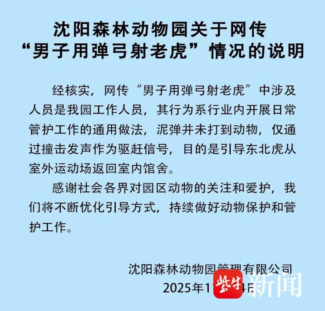 记者注意到,就在昨晚9点多,沈阳森林动物园发布了关于网传“男子用弹弓射老虎”情况的说明。该园称,经核实,网传“男子用弹弓射老虎”中涉及人员是动物园工作人员,其行为系行业内开展日常管护工作的通用做法,泥弹并未打到动物,仅通过撞击发声作为驱赶信号,目的是引导东北虎从室外运动场返回室内馆舍。沈阳森林动物园表示,感谢社会各界对园区动物的关注和爱护,将不断优化引导方式,持续做好动物保护和管护工作。