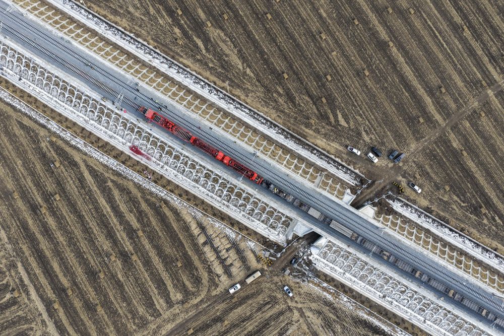 这是11月25日在黑龙江省绥化市庆安县永华村拍摄的哈伊高铁哈铁段铺轨现场(无人机照片)。