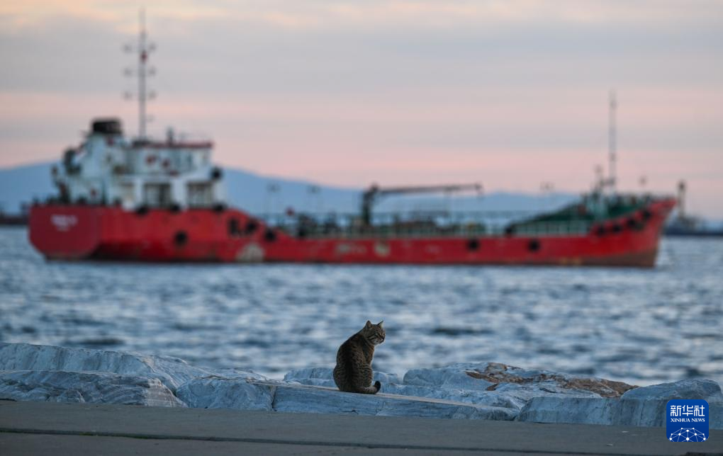 11月25日,一只猫在土耳其伊斯坦布尔马尔马拉海岸边休憩,不远处的海面上停泊着一艘船。