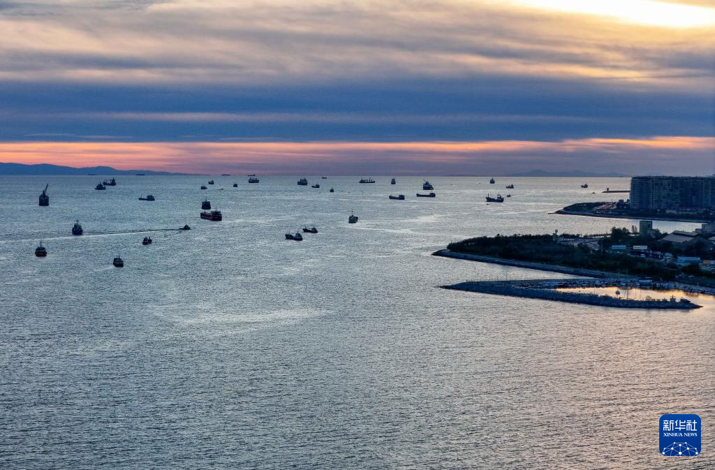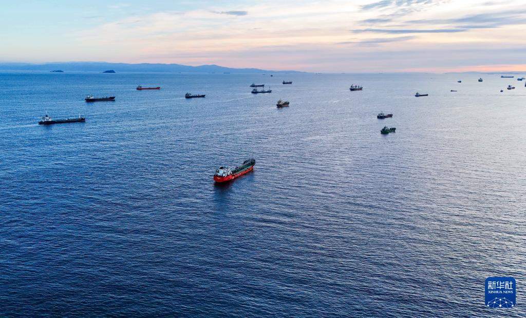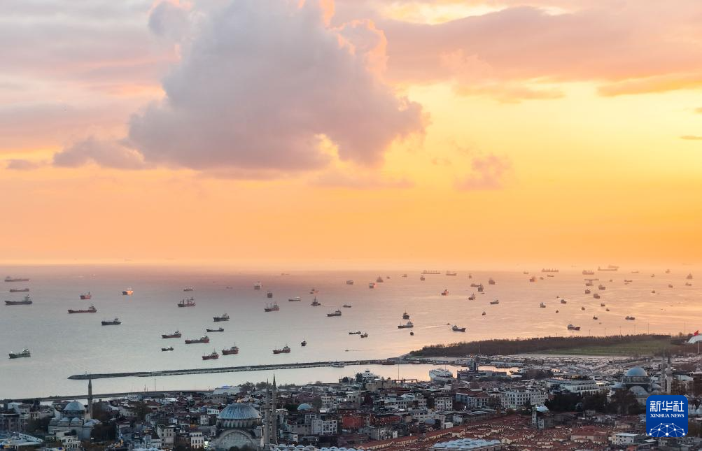 这是11月25日拍摄的停泊在土耳其伊斯坦布尔马尔马拉海上的船只(无人机照片)。