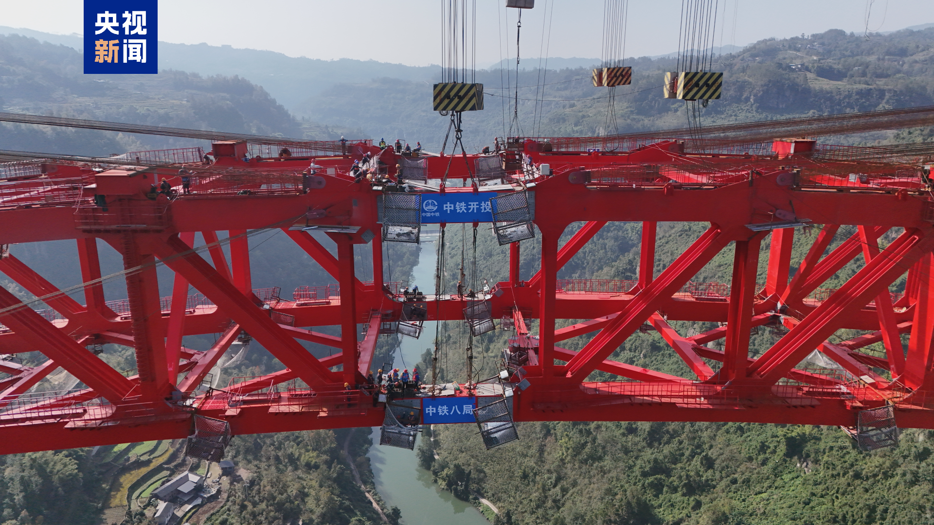 据施工方中铁八局介绍,凤来大溪河特大桥全长1136.7米,主桥采用580米上承式钢箱桁架拱桥,为目前世界跨径最大的钢拱桥。大桥地处武隆区高陡深切峡谷地带,桥面距河面高差超310米,相当于100层楼的高度,全桥采用全钢结构,总用钢量2.5万吨,双平行主桁变截面桁架式结构,最大单节段桁片长39.5米,高18米,重425吨,相当于6层楼高,约140头成年大象的重量。