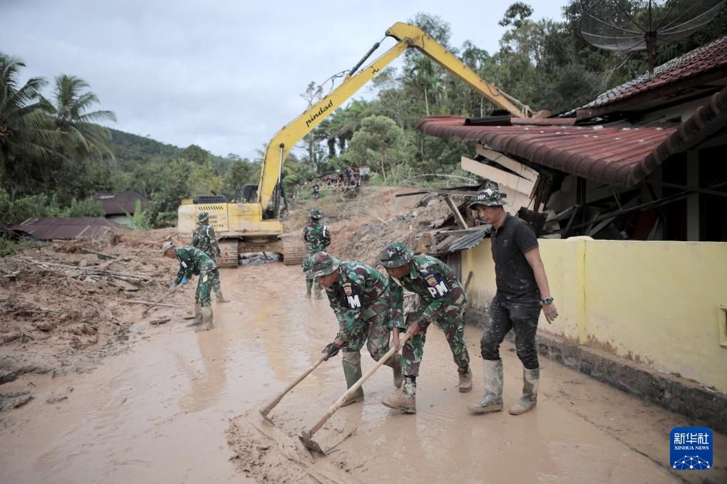 11月28日,在印度尼西亚北苏门答腊省,救援人员和村民一起清理淤泥。新华社发(金廷摄)