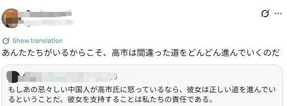 支持日本右翼的网民破防称,“如果中国人对高市感到愤怒,那恰恰说明她正走在正确的道路上。支持她是我们的责任。”
