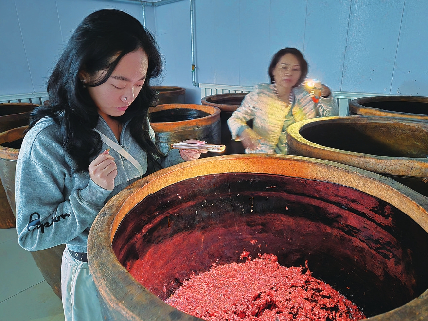 最令人印象深刻的是熏醅工序。在封闭的熏醅房里,炭火把醅料烤得微微焦黄,空气中弥漫着浓郁的烟熏香。工人们用长木铲翻拌,每一次翻动,都让醅料吸收更多烟火气。“这是我们山西人的独门功夫,”公司销售负责人唐诗惠说,“熏醅不仅能上色,还能让醋有独特的熏香,不需要任何色素。”