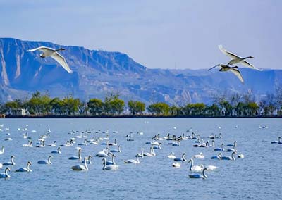 最近,随着近千只白天鹅陆续飞抵,圣天湖湿地正式迎来了一年一度的“天鹅季”。它们在此栖息觅食、嬉戏飞翔,将以此地为家,度过长达数月的越冬时光,为这片黄河湿地奏响了冬日浪漫的序曲。