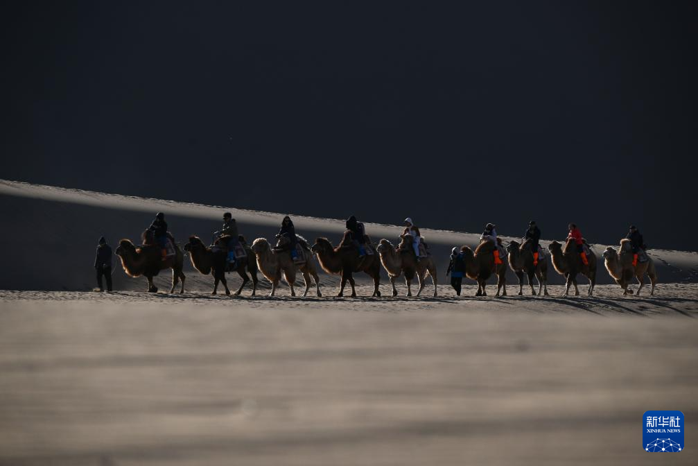 12月1日,游客在甘肃省敦煌市鸣沙山月牙泉景区游览。