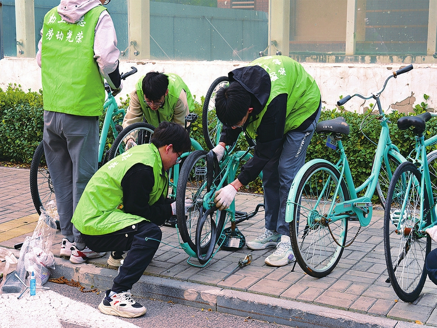 太原理工大学参与“公益单车”项目的学生正在维修废旧自行车。