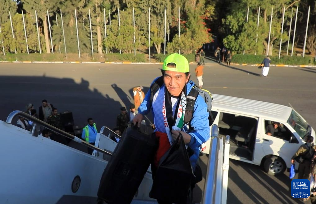 这张12月3日的视频截图显示,在也门首都萨那国际机场,被释放的船员登机。