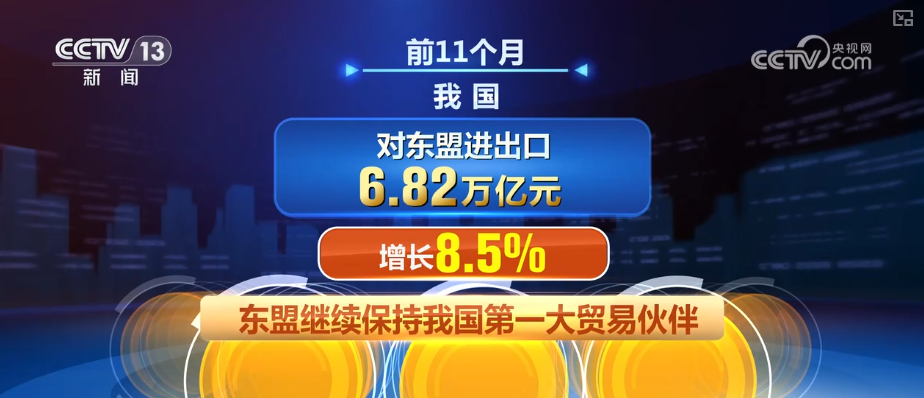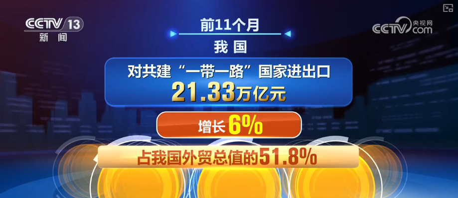 前11个月,我国对共建“一带一路”国家进出口21.33万亿元,增长6%,占我国外贸总值的51.8%。对东盟进出口6.82万亿元,增长8.5%,东盟继续保持我国第一大贸易伙伴。对欧盟进出口5.37万亿元,增长5.4%,欧盟为我国第二大贸易伙伴。