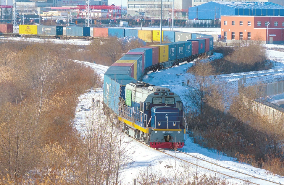 12月9日,一列中欧班列驶出中国铁路哈尔滨局集团有限公司同江北站换装场。今年中欧班列“东通道”通行班列数量已达5166列,运送各类货品超53万标准箱,为服务高水平对外开放提供了强劲动能。