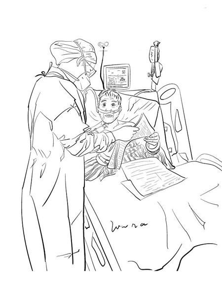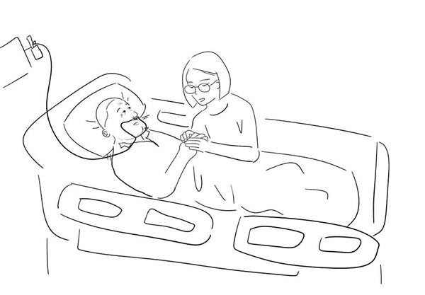 最近,她创作了一幅孙女和爷爷的漫画,记录了29岁的孙女经常来ICU探望爷爷的场景。“爷爷患有呼吸系统疾病,病情呈进展趋势。孙女天天来看他,帮他擦手。”刘娜说,在ICU,隔代亲属如此频繁的探视并不常见,这种感情很难得,很动人。