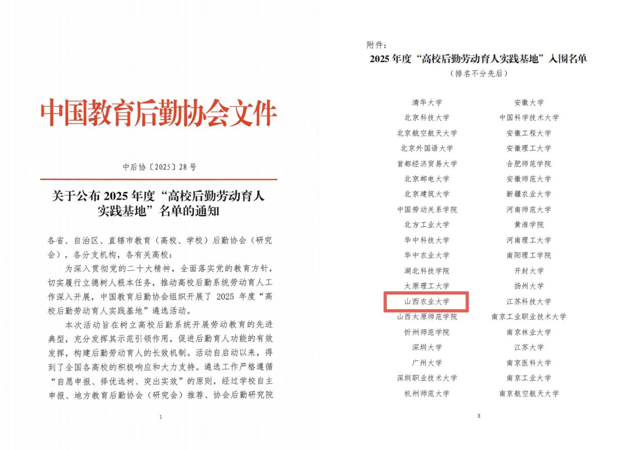 12月11日,中国教育后勤协会印发通知,公布2025年度全国“高校后勤劳动育人实践基地”入围名单,我校成功入选。全国“高校后勤劳动育人实践基地”是后勤保卫部在劳动教育方面获得的新突破,也是落实“三服务三育人”理念进程中继“全国最美后勤人”后取得的又一块新拼图。