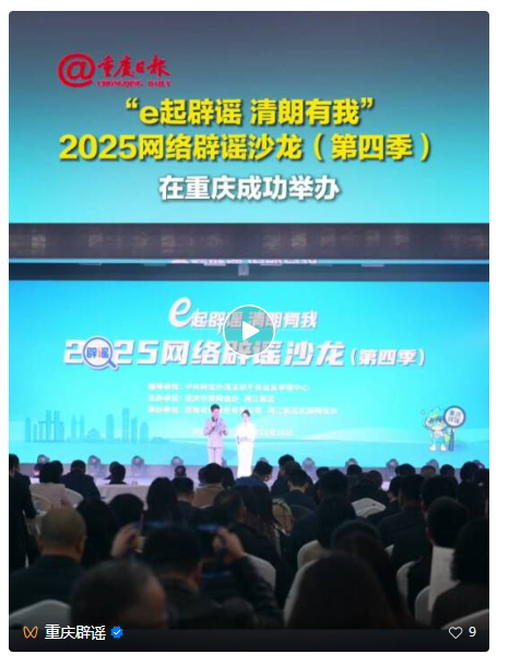 活动现场发布了《2025重庆网络辟谣年度十大案例》《重庆网络谣言治理研究报告(2025)》,以及重庆市“首批涉企网络举报辟谣工作直联点”试点单位。