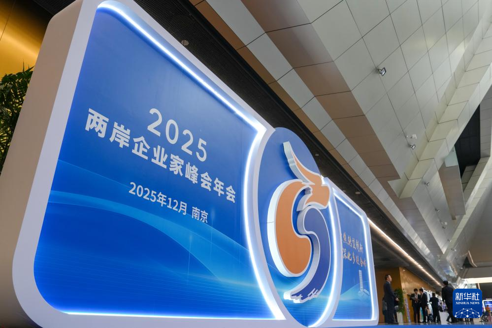 这是12月16日拍摄的2025两岸企业家峰会年会主会场入口处的展板。