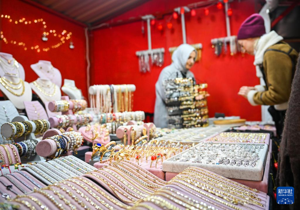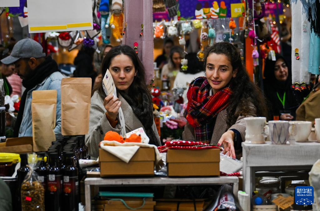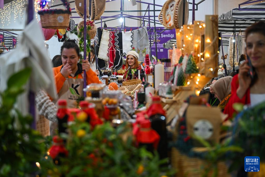 随着新年临近,土耳其伊斯坦布尔加拉塔港的钟楼广场搭建好帐篷举办新年购物节,售卖与节日相关的商品。