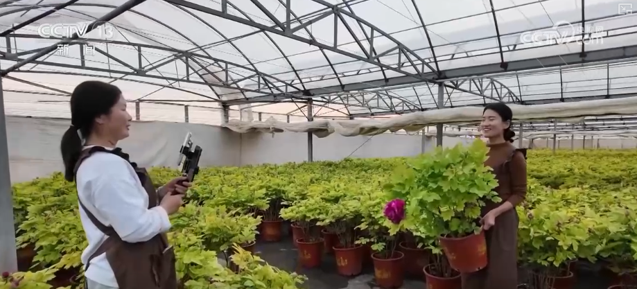 除了线下销售渠道,工作人员也在大棚里架起手机,通过网络直播把牡丹卖到全国各地。