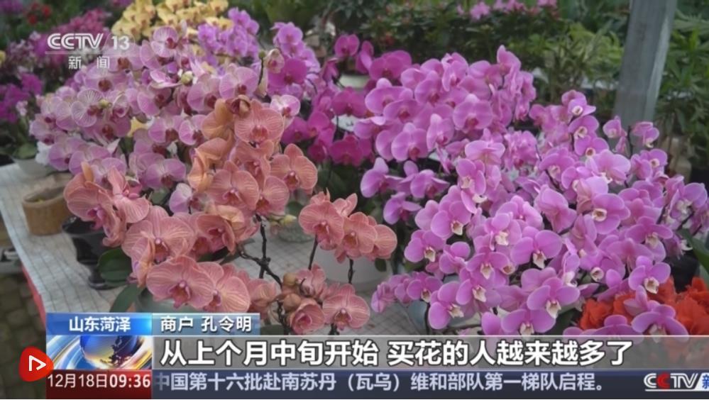 在山东菏泽花卉大市场,蝴蝶兰、杜鹃、仙客来等年宵花已经摆上了货架,商户们正忙着整理花枝、打包鲜花。