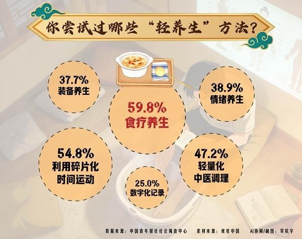 中国青年报社社会调查中心的数据显示,97.2%的受访青年尝试过“轻养生”方法,食疗养生(59.8%)、利用碎片化时间运动(54.8%)、轻量化中医调理,如用艾草锤“拍八虚”、按穴位(47.2%)是受访青年尝试最多的3种方法。其他还有:情绪养生,如正念冥想、定期“精神断网”(38.9%),装备养生,如用按摩仪、泡脚桶、护腰靠垫、颈椎枕(37.7%),数字化记录,如用App记录睡眠、戴手环监测(25.0%)等。