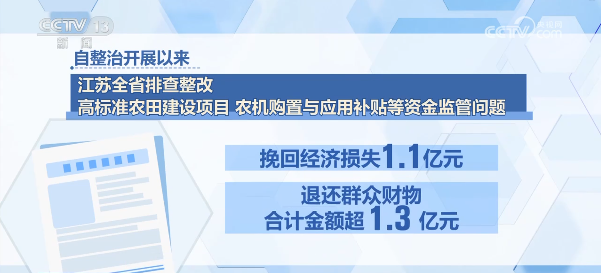 据统计,自整治开展以来,江苏全省排查整改高标准农田建设项目、农机购置与应用补贴等资金监管问题,及时兑付补贴款及项目资金5.44亿元,通过“一卡通”发放20类涉农补贴88.02亿元,惠及1100多万人次,挽回经济损失1.1亿元,退还群众财物合计金额超1.3亿元。