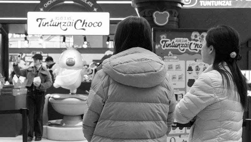 图为商场里穿着“排骨羽绒服”的消费者在排队购物。陈跃佳 摄
