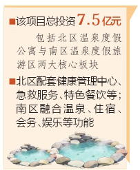 北区占地3.8万平方米,规划建设10栋现代风格园林式公寓,配套健康管理中心、急救服务、特色餐饮等。南区占地4万平方米,建筑面积3.9万平方米,融合温泉、住宿、餐饮、会务、娱乐等多元功能,设计同时接待3000人。