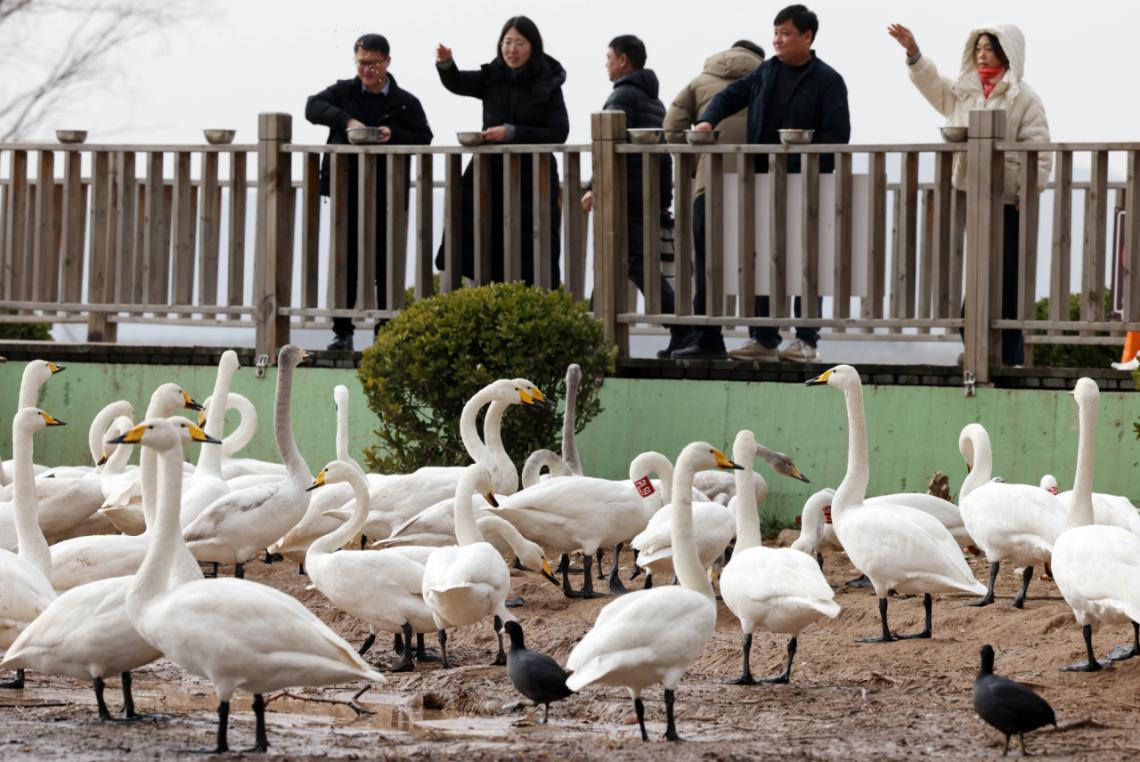 12月23日,在山西省运城市平陆县黄河湿地,游客向成群白天鹅投喂玉米。朱兴鑫 摄