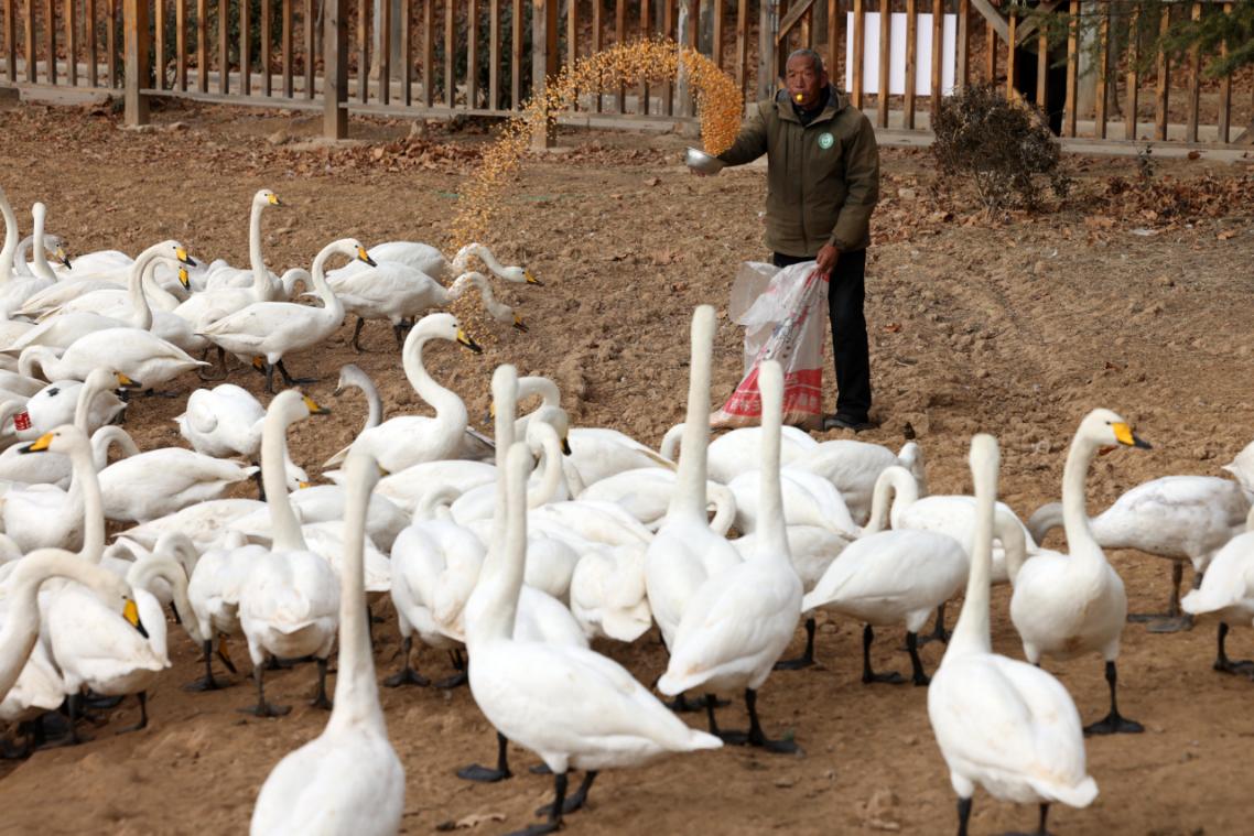 12月23日,在山西省运城市平陆县黄河湿地,野生动物巡护员何建喜向成群白天鹅投喂玉米。 朱兴鑫 摄
