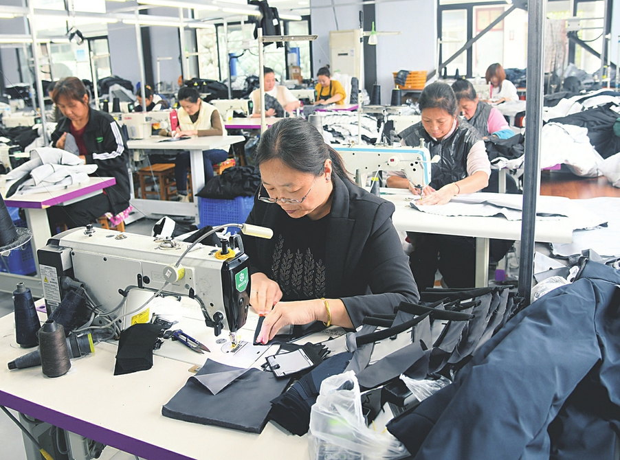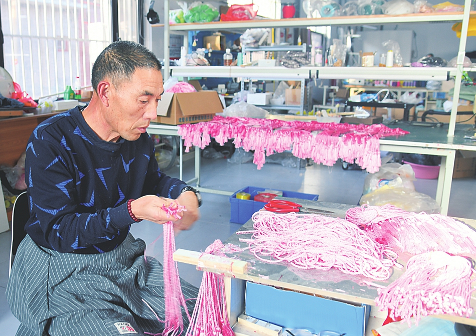西官庄人从众帮扶车间内,工人正在加工服装。 杨秀文 温徐旺摄