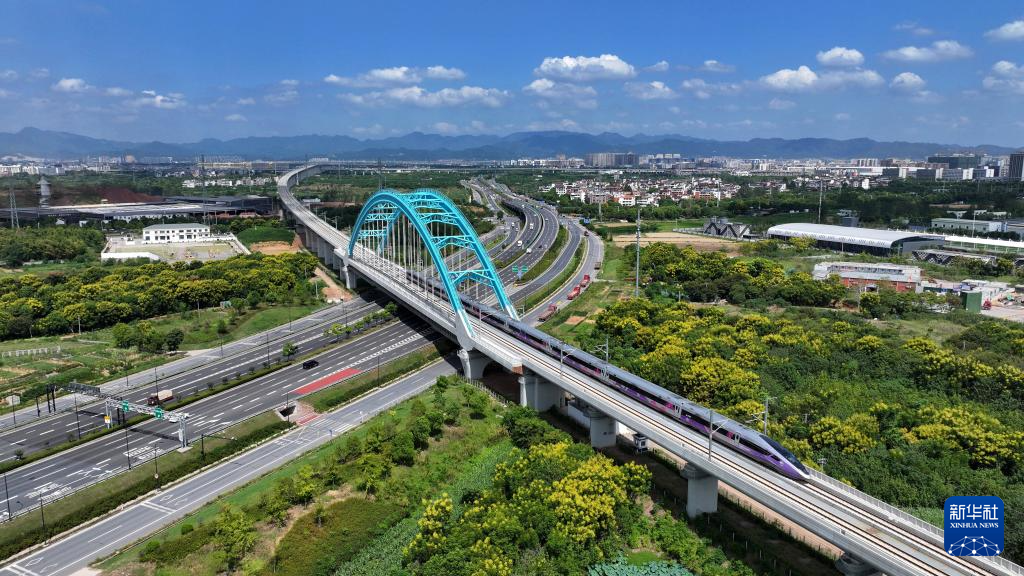 2024年9月6日,杭温高铁正式开通运营。这是列车行驶在杭温高铁浙江省义乌市境内(无人机照片)。新华社发(吕斌摄)