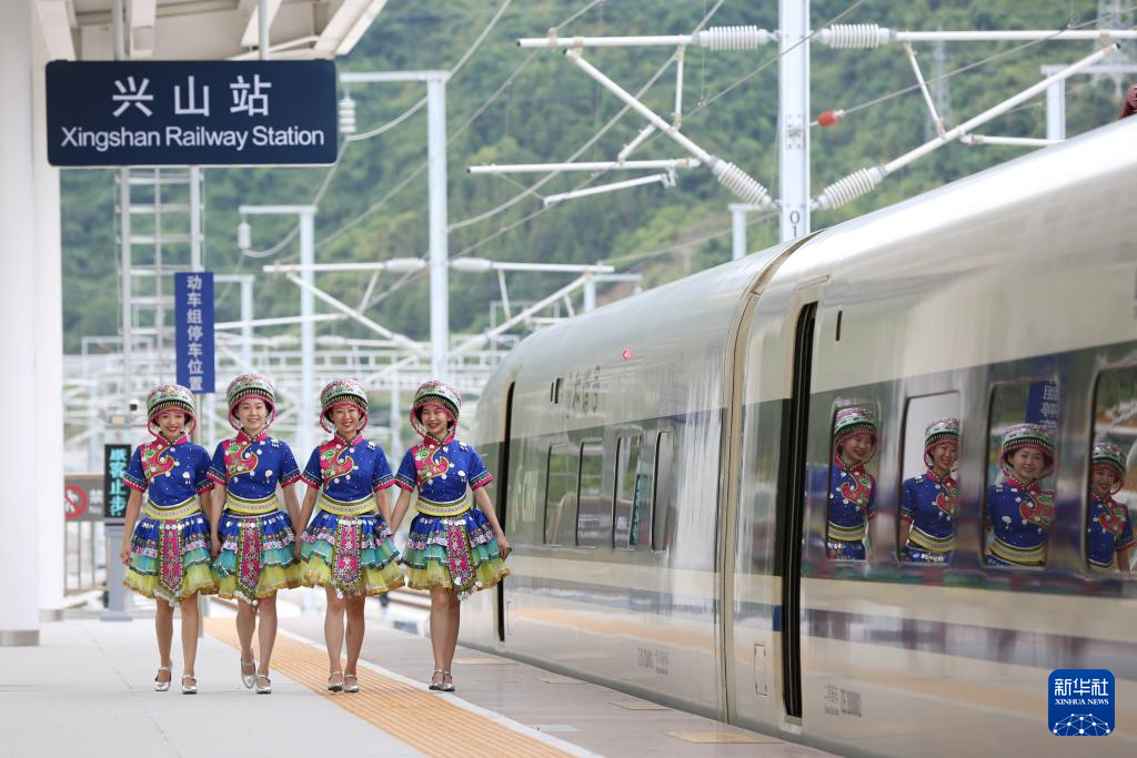 2022年6月20日,郑渝高铁实现全线贯通运营。这是在郑渝高铁兴山站,身着表演服的列车乘务员准备乘车为乘客表演节目。新华社发(杨东摄)