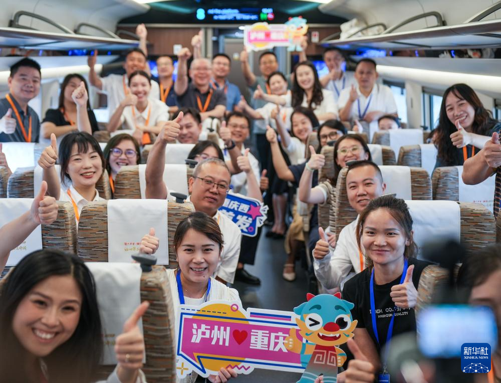 2024年9月29日,渝昆高铁重庆西至宜宾东段开通运营,两地间最快48分钟可达。这是乘坐G5766次列车的乘客在车厢内合影。新华社发(费思童摄)