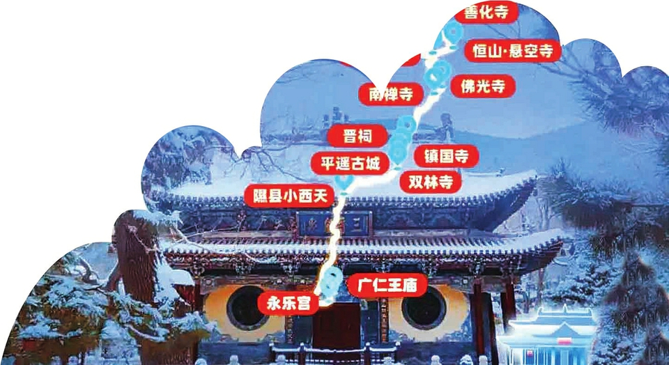 图③:省文旅厅推出从晋北到晋南的线路,囊括云冈石窟、悬空寺、应县木塔、晋祠、平遥古城、永乐宫等景区。