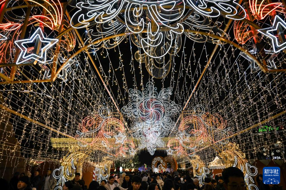 2025年12月31日,人们走过哈萨克斯坦阿拉木图的新年灯饰。