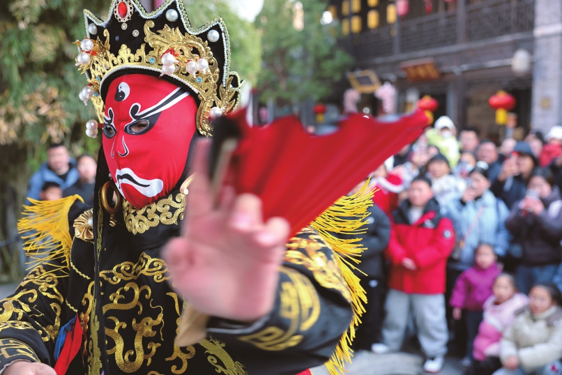 1月1日,在京杭大运河畔的山东省枣庄市台儿庄古城,民间艺人在进行“变脸”表演。
